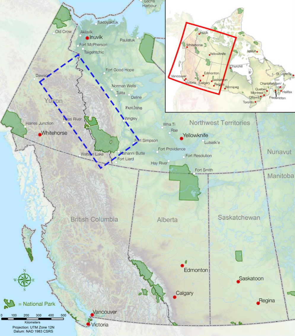 In the image below, the blue dashed line shows the approximate boundary of the Mackenzie Mountain Range.